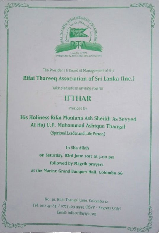 Annual Ifthar for Hijri 1438 was held on the 3rd of June 2017 (8th day of Ramadan 1438) at the Marine Grand Banquet Hall, Colombo-06.