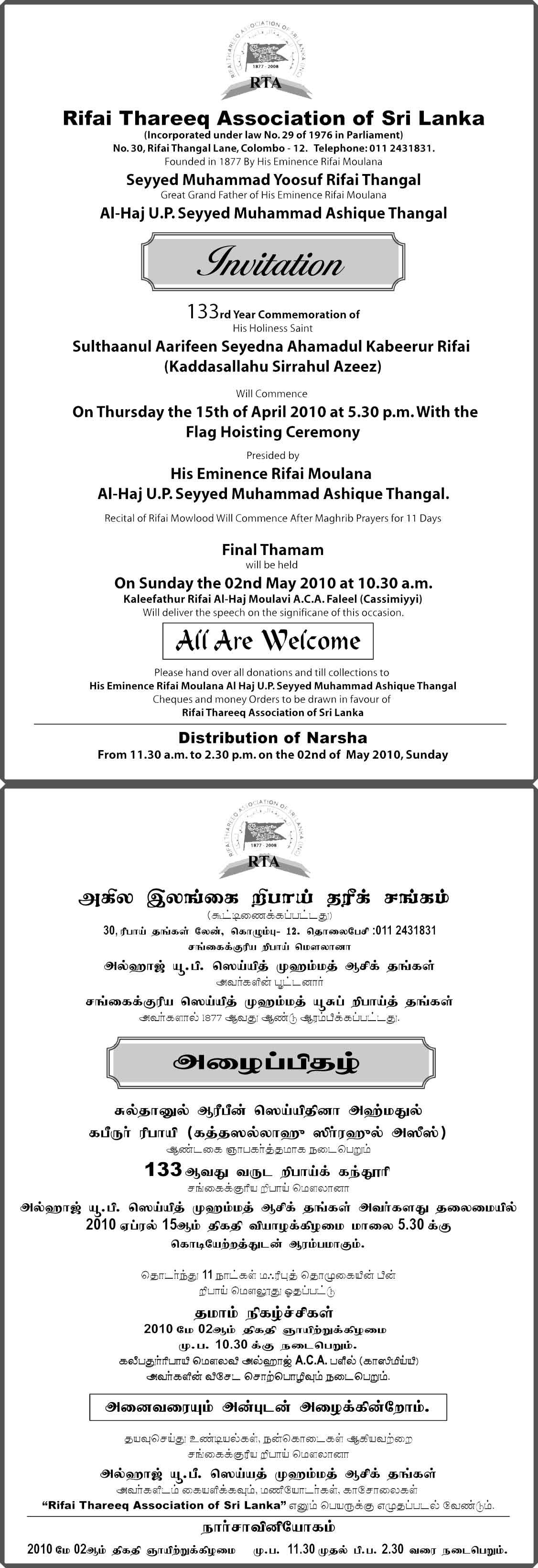 137th year commemoration of Sultan ul Aarifeen Seyyed Ahmed ul Kabeer ur Rifai (Qaddasallahu Sirrahul Azeez) was held on the 23rd of March 2014 at Rifai Thareeq Association HQ, No:30, Rifai Thangal Lane, Colombo-12.