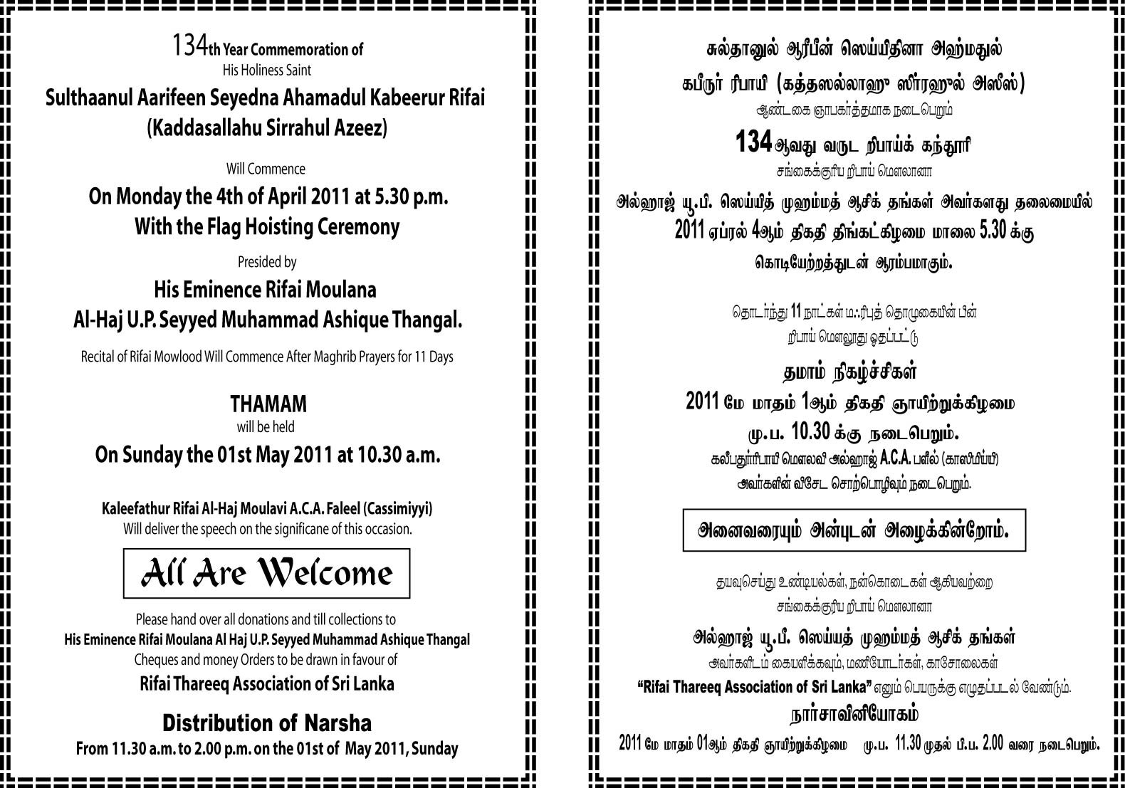Flag Hoisting & Rifai Rathib to mark 127th year commemoration of Sultan ul Aarifeen Seyyed Ahmed ul Kabeer ur Rifai (Qaddasallahu Sirrahul Azeez) will be held at Kapuwatta Muhiyaddeen Jumma Masjid,Kapuwatta, Denipitiya, Weligama, on the 25th of September 2014.