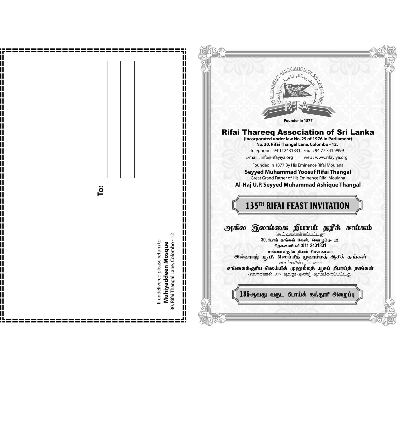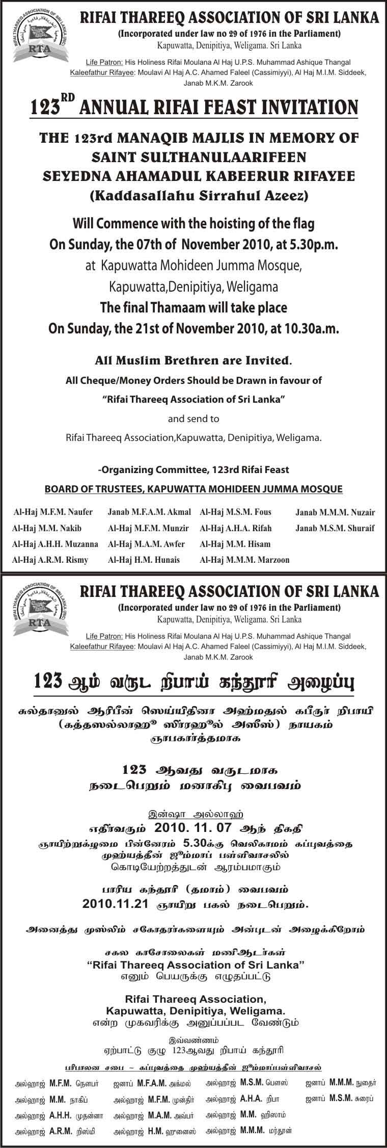 The opening of the Re-constructed Rifai Thareeq Association and Muhiyaddeen Thakkiya at No:30, Rifai Thangal Lane, Colombo-12 took place on the 14th of January 2014 (12th Day of Rabiul Awwal 1435) at 10:30 A.M.